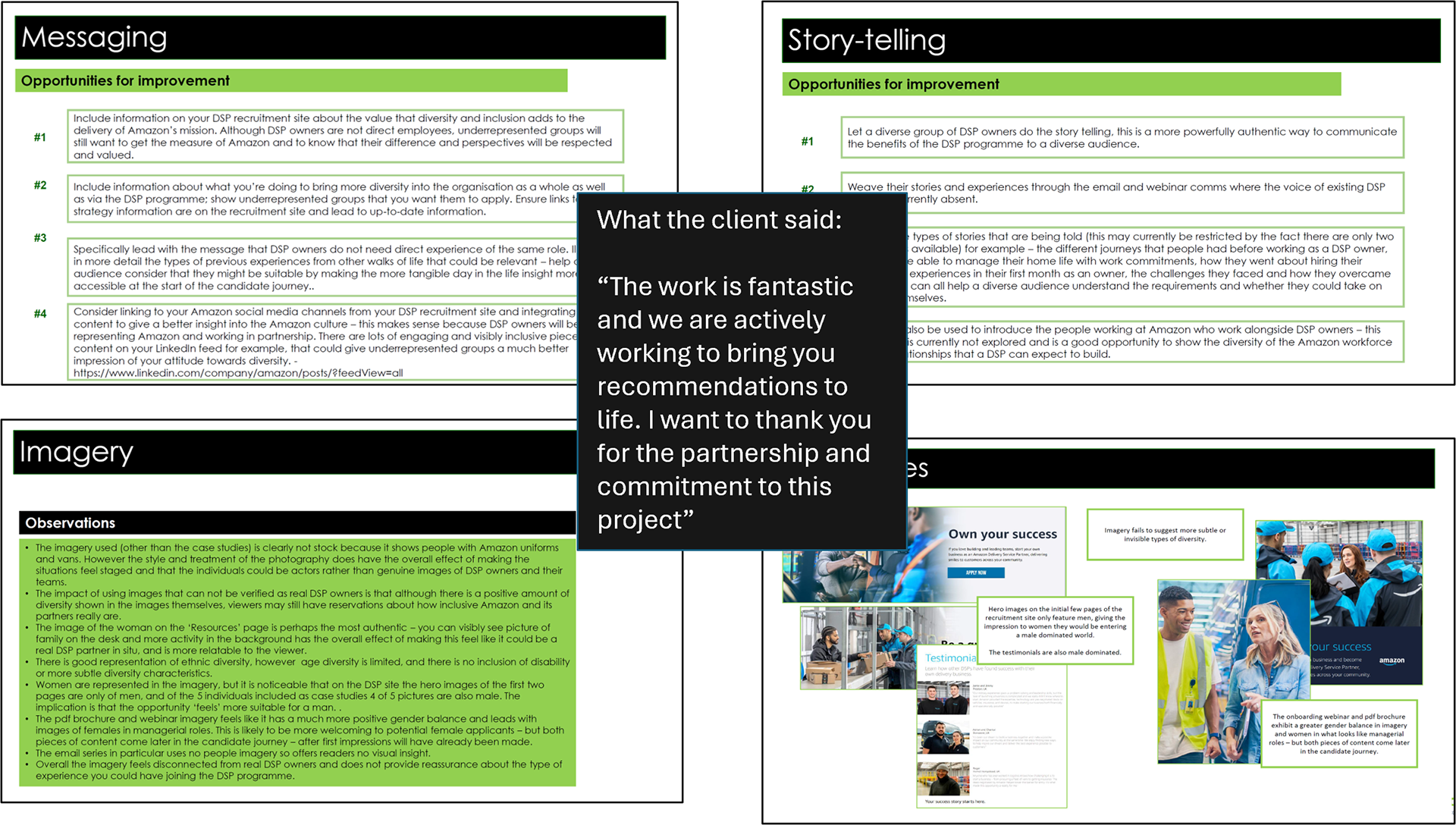 Understanding the mindset of female entrepreneurs to support the gender diversification of applicants to Amazon’s Delivery Service Partner (DSP) Programme in the UK, Germany, Spain and Italy. Involved auditing Amazon’s recruitment communications and messaging through the candidate journey, interviewing existing female DSP Partners, and engaging with potential female candidates.