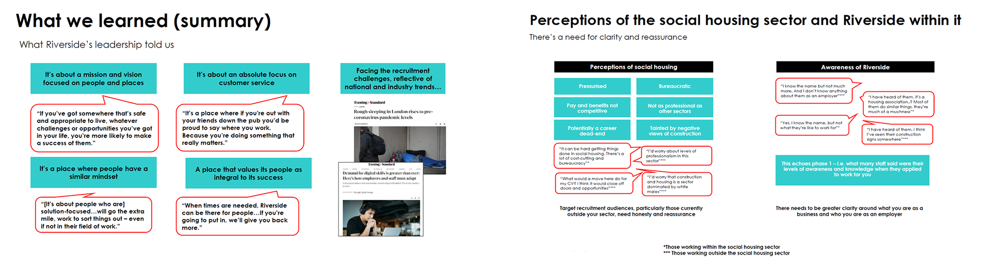 Creating an EVP for a social housing group during a time of corporate flux, focusing on internal research with employees at different stages of tenure to keep costs low. Using insight to understand the differences in motivations between those in caring roles vs those in office roles, and those with social care backgrounds vs those transferring in from the private sector. Equipping Riverside to design and develop its own creative.